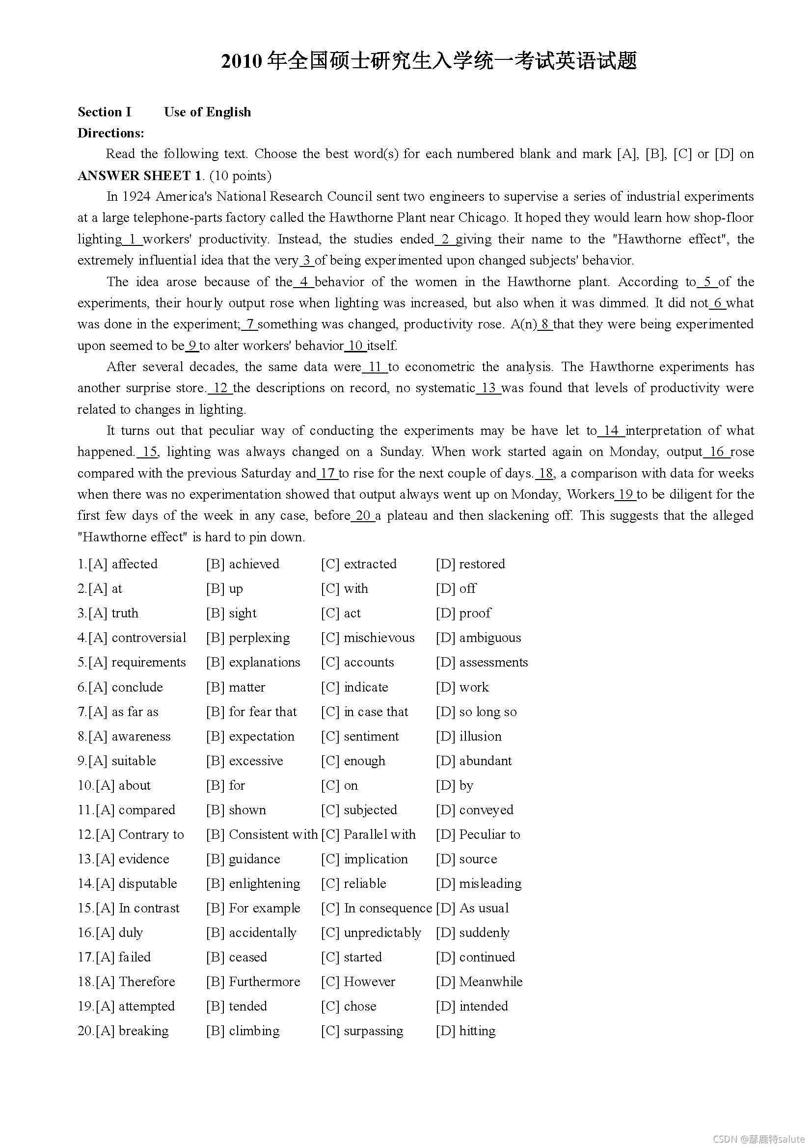 本文主要是介绍2010年全国硕士研究生入学统一考试英语试题,希望对大家解决编程问题提供一定的参考价值,需要的开发者们随着小编来一起学习吧!