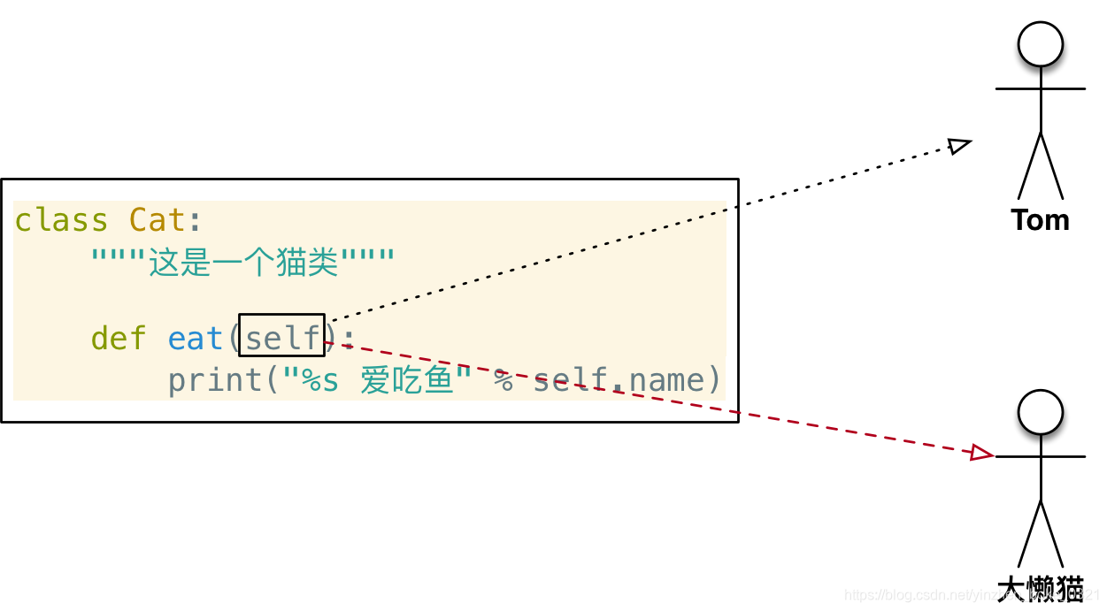 class Cat:"""这是一个猫类"""def eat(self):print("小猫爱吃鱼")def drink(self):print("小猫在喝水")tom = Cat()