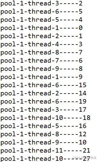 }class Task implements Runnable{int i;public Task(int i) {this.i = i;}@Overridepublic void run() {//打印当前线程的名字System.out.println(Thread.currentThread().getName() + "-----" + i);}