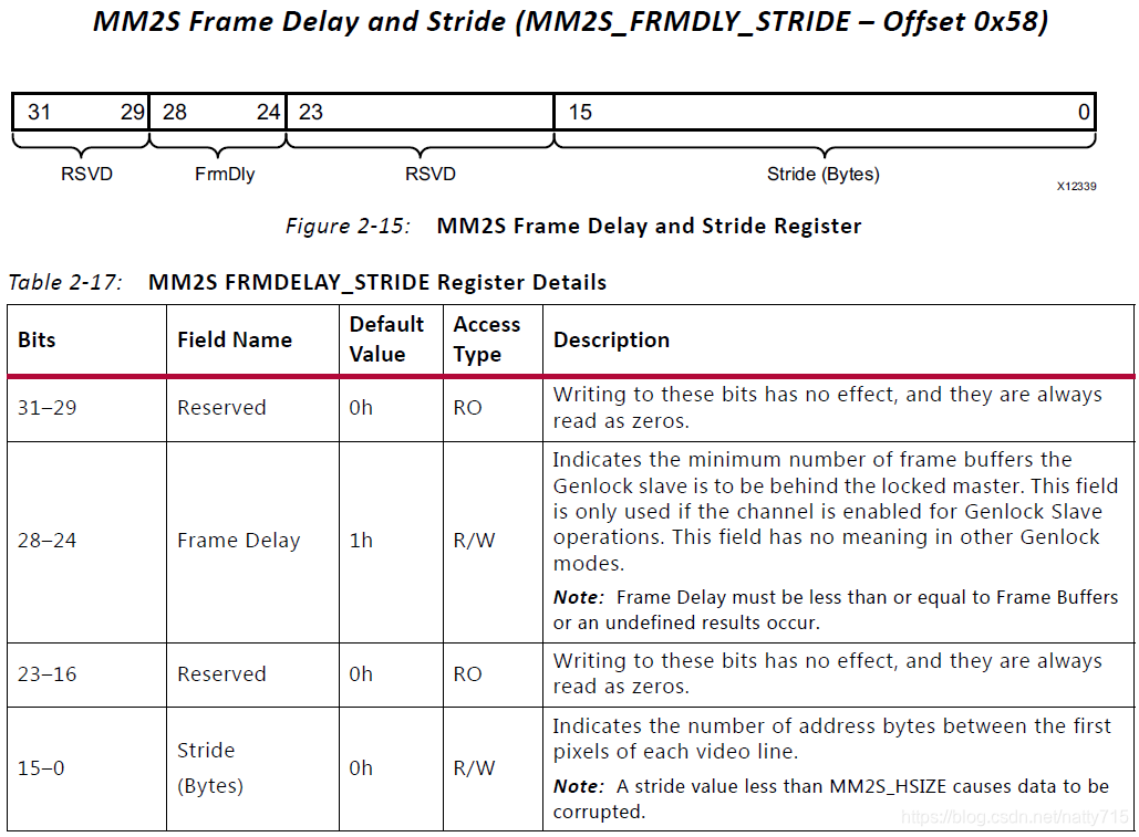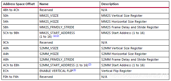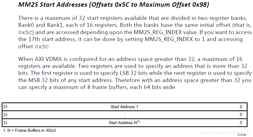 从5Ch~98h有最多32个寄存器可用于存放帧起始地址,32个寄存器划在两个bank上,根据MM2S_REG_INDEX来指定bank的值,每个bank上16个寄存器有相同的起始偏移地址,都是0x5C,举个例子,访问第1个寄存器时,MM2S_REG_INDEX给0,偏移地址0x5C,访问第17个寄存器时,MM2S_REG_INDEX给1,偏移地址0x5C。