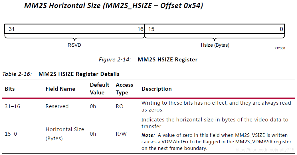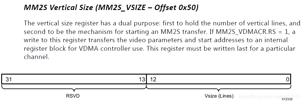 50h,用于设置垂直方向上总共有多少行数据,并启动VDMA传输,除此之外,当MM2S_VDMACR.RS=1时,对该寄存器写操作会将所有设定传给VDMA内部对应寄存器,所以,对于VDMA某通道配置时,必须,在最后设置50h寄存器。