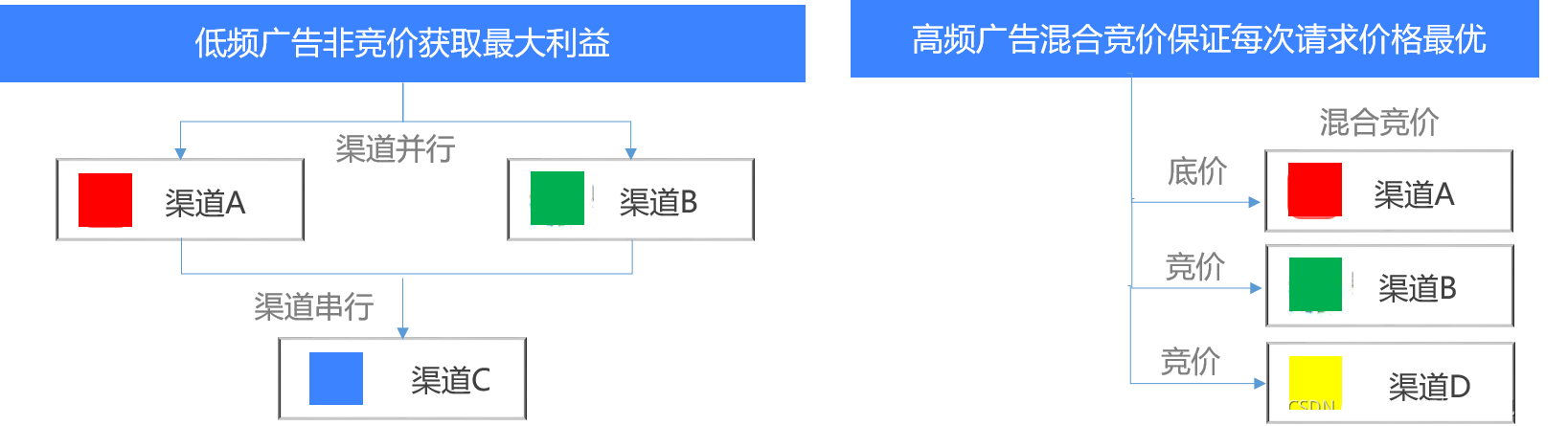 (2)对低频广告位的请求采取渠道串并行的混合策略:按底价规则并行渠道A和渠道B ,因为底价规则可能会屏蔽掉一部分广告,出现无广告返回的现象,因此在并行后再串行渠道C,保证广告填充。