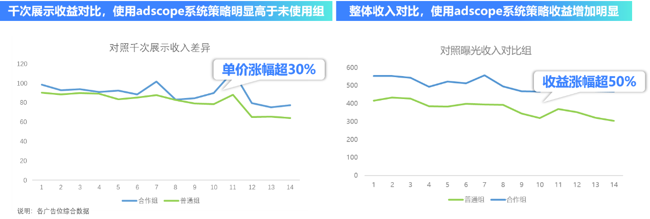 通过数据对比,在借助ADSCOPE进行策略优化后,媒体的广告eCPM涨幅超过30%,整体收益涨幅超过50%。