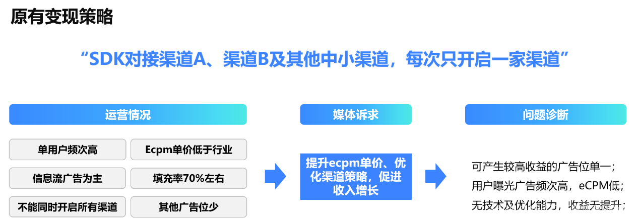 (4)媒体团队不具备优化的技术和能力,虽然接入了多个广告变现渠道,但是每次只能开启一个渠道。没有流量变现策略优化经验,广告收益一直不佳。