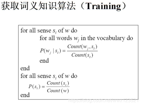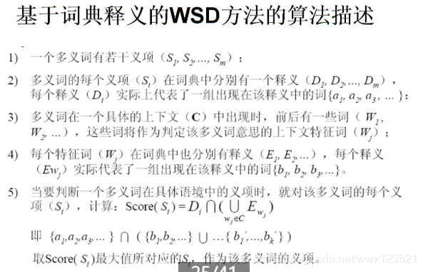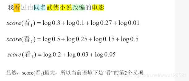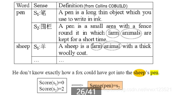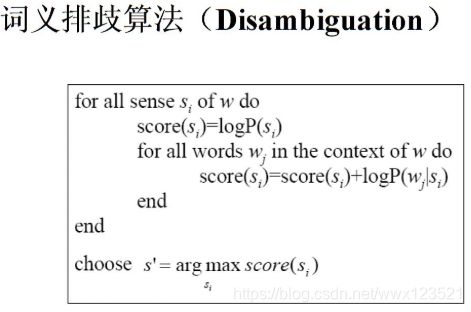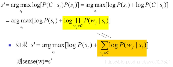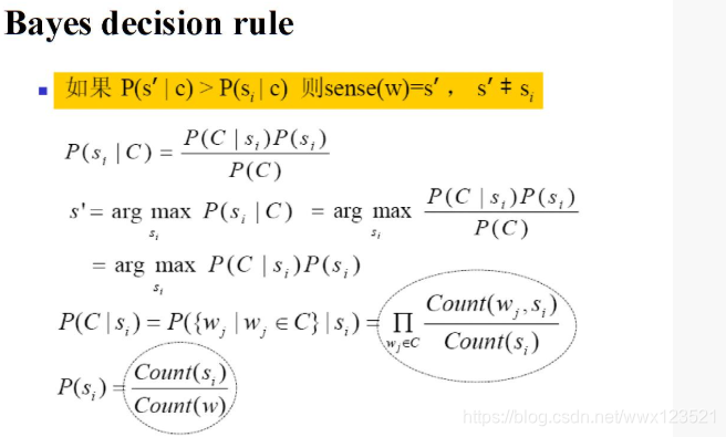 计算给定上下文语境下,取哪一个义项的可能性最高。P(当前词语所存在的上下文|某一义项)P(某一义项),是某一义项和上下文的联合分布概率,再除以分母P(当前词语所存在的上下文),计算出来的结果就是P(某一义项|当前词语所存在的上下文),就能根据上下文去求得概率最大的义项。