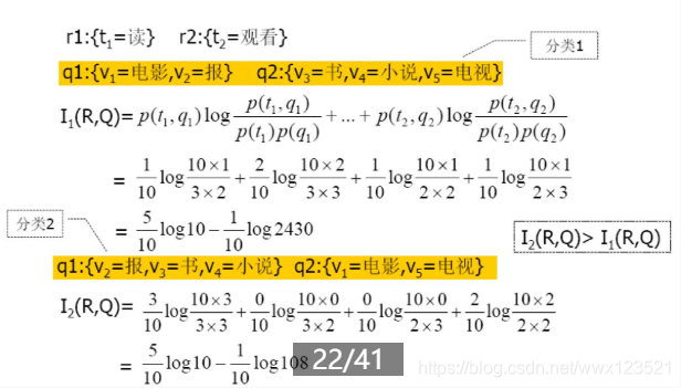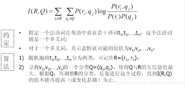 Flip-Flop算法给出的方法是,试试。把方块分成两个集合,球也分成两个集合,然后看看情况怎么样,如果情况不好就继续试,找到最好的划分。然后需要解决的问题就是,怎么判定分的好不好?用互信息。如果两个上下文集(方块集)和两个词翻译集(球集)之间的互信息大,那我们就认为他们的之间相关关系大,也就与原来两个义项完美划分更接近。