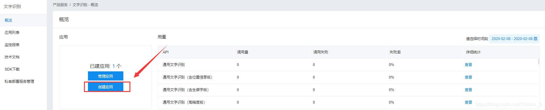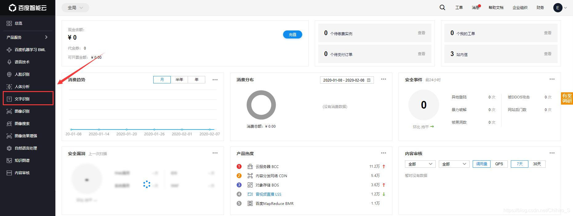 2.登录成功后,在左边菜单栏找到自己要使用的服务,这里以文字识别为例。