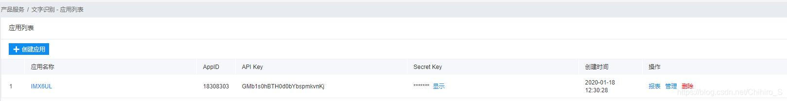 回到应用列表我们可以看到已创建的应用了,这里面有三个值 AppID , API Key , Secret Key 记住可以从这里面看到 , 在之后的学习中我们会用到。