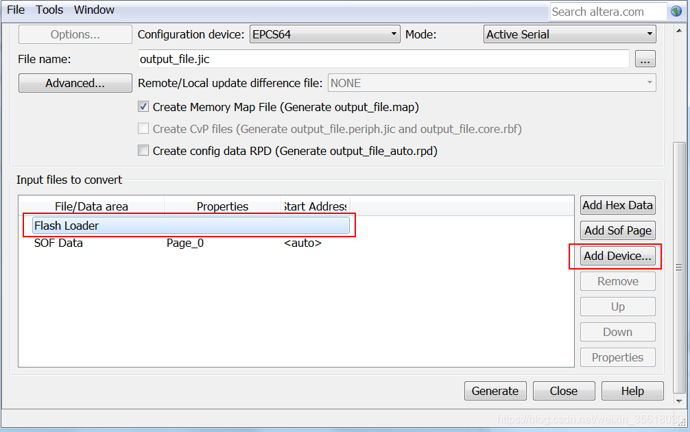 选中SOD文件,选择add file,弹出的对话框中找到自己的工程编译生成的sof文件。 - 生成文件,点击Generate,生成路径下即可看到outputfile.jic