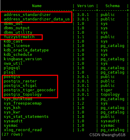 检查扩展的安装,使用\dx命令检查,创建 所有扩展功能,完成如下图红框中功能模块启动.