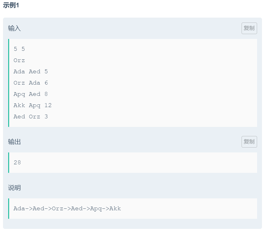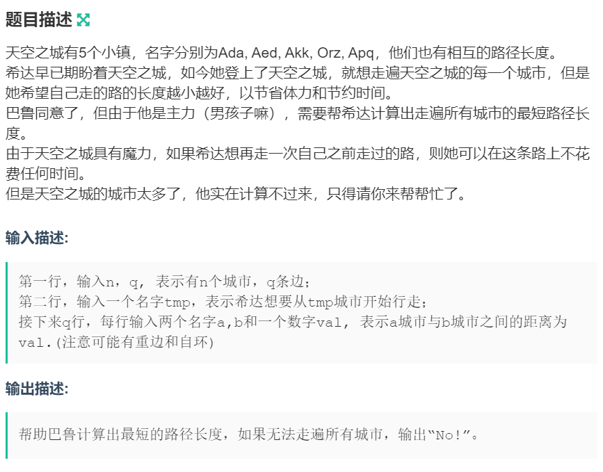{IOS;while(cin >> n >> m){pos.clear();for(int i = 1 ; i <= n ; i ++) f[i] = i; //初始化并查集的父标记数组cin >> a;int tt = 0;for(int i = 1 ; i <= m ; i ++){cin >> a >> b >> val;if(!pos[a]) pos[a] = ++tt;if(!pos[b]) pos[b] = ++tt;g[i] = {pos[a], pos[b], val}; //建边}sort(g+1,g+m+1); //利用边的权值进行排序int ans = 0;for(int i = 1 ; i <= m ; i ++){int fx = find(g[i].x) , fy = find(g[i].y);if(fx == fy) continue;f[fx] = fy;ans += g[i].w;}int fa = find(f[1]) ; //找到根节点int flag = 0;for(int i = 1 ; i <= n ; i ++){if(find(f[i]) != fa){ //如果某个城市不连通cout << "No!" << endl;flag = 1;break;}}if(!flag) cout << ans << endl;}return 0;