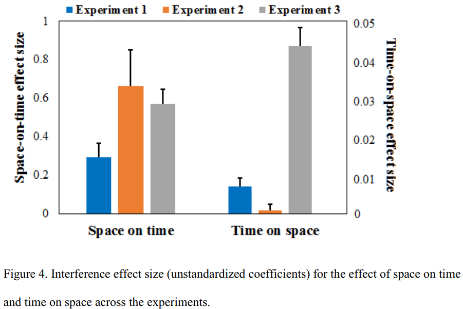 ② time-on-space effect:实验3的效应显著大于实验1和2,说明dynamic unfilled length条件下时间对空间的影响比unfilled/filled length条件下都大。