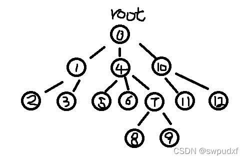 node 10: parent = 0, depth = 1, internal node, [11, 12]