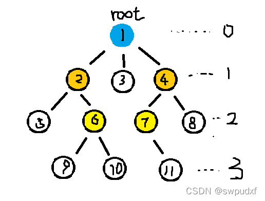 从根到节点x的路径长度成为x的深度,如图中2,3,4的深度都为2,图中5,6,7,8为2。另外节点x到叶节点的最大路径长度也被成为节点x的高,如图中节点8,10,5,3的高为0,节点6,7的高为1,节点2,4的高为2。