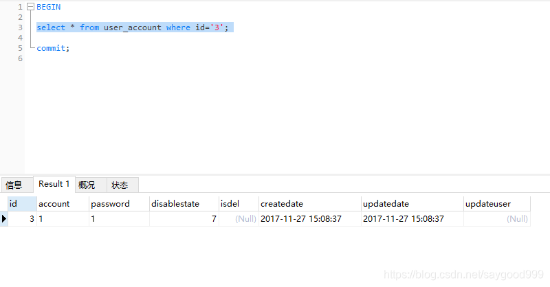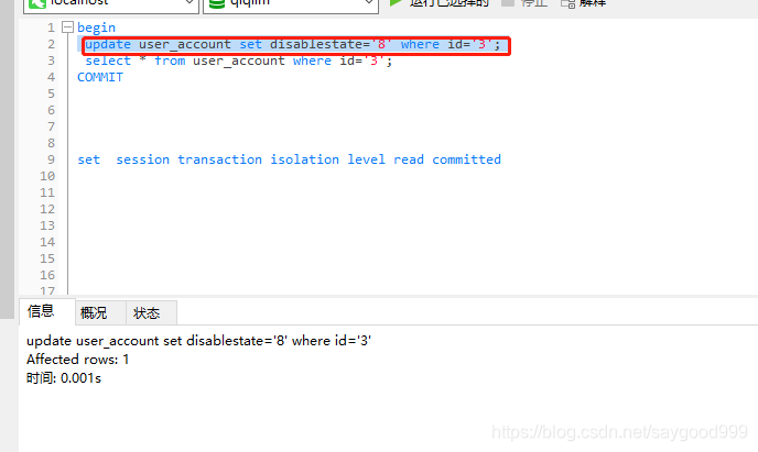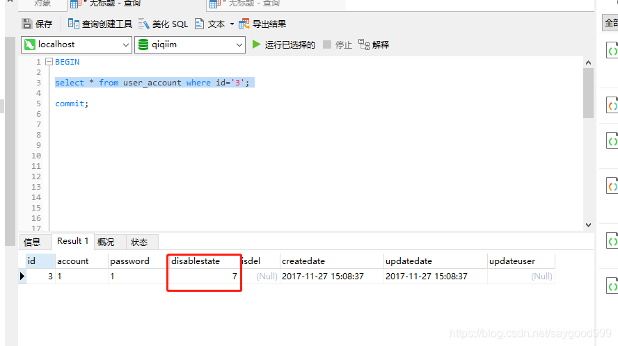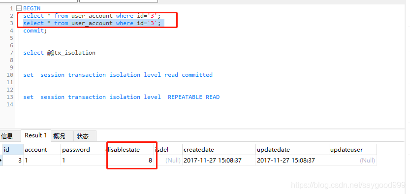 读取到disablestate为7。在修改的数据的窗口。提交事务,执行第三行sql