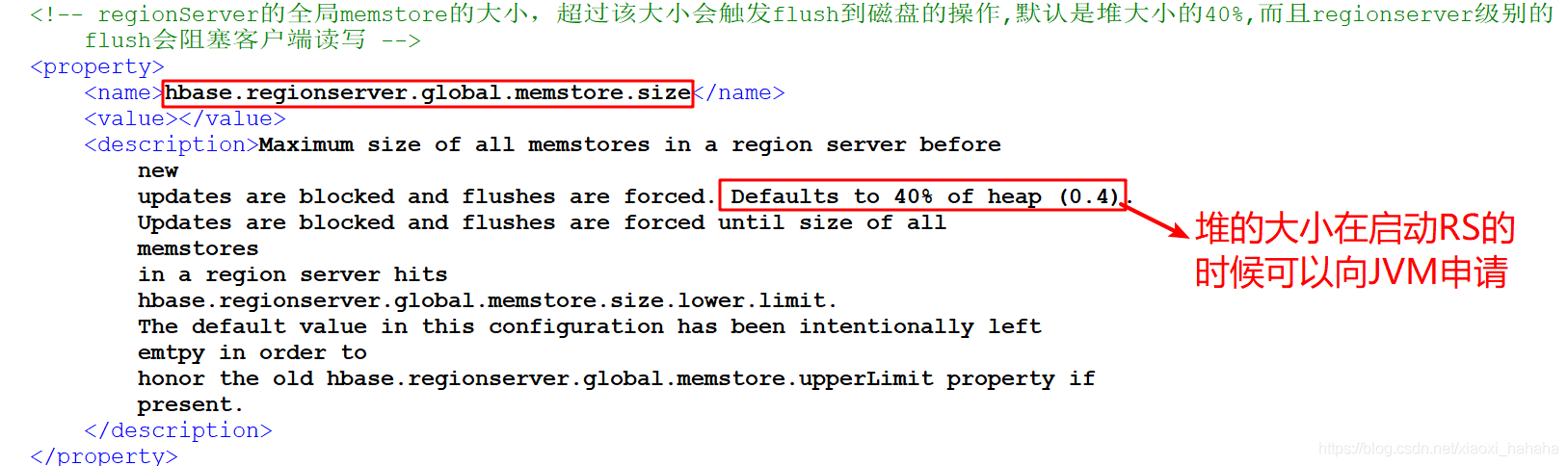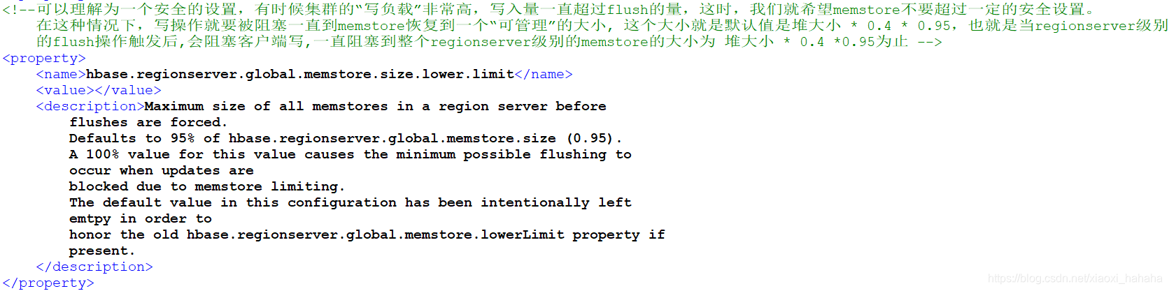 可以理解为一个安全的设置,有时候集群的“写负载”非常高,写入量一直超过flush的量,这时,我们就希望memstore不要超过一定的安全设置。 在这种情况下,写操作就要被阻塞一直到memstore恢复到一个“可管理”的大小, 这个大小就是默认值是堆大小 * 0.4 * 0.95,也就是当regionserver级别 的flush操作触发后,会阻塞客户端写,一直阻塞到整个regionserver级别的memstore的大小为 堆大小 * 0.4 *0.95为止。