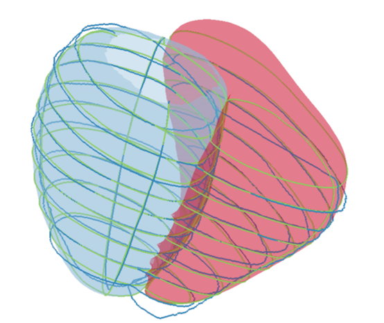 图1: 符合实际轮廓的左心室心外膜和右心室心内膜的SSM示例。 深蓝色轮廓代表实际轮廓。 绿色轮廓代表通过在CMR采集轮廓平面的相同空间位置上对SSM进行切片而生成的合成轮廓