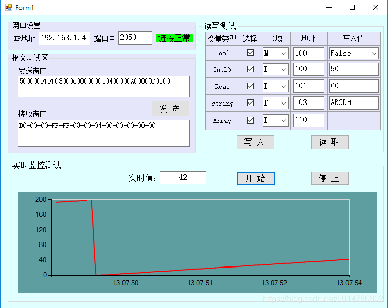 2.程序可以实时监控网络状态,具有断网重连功能。并举例采集实时曲线,测试运行稳定。