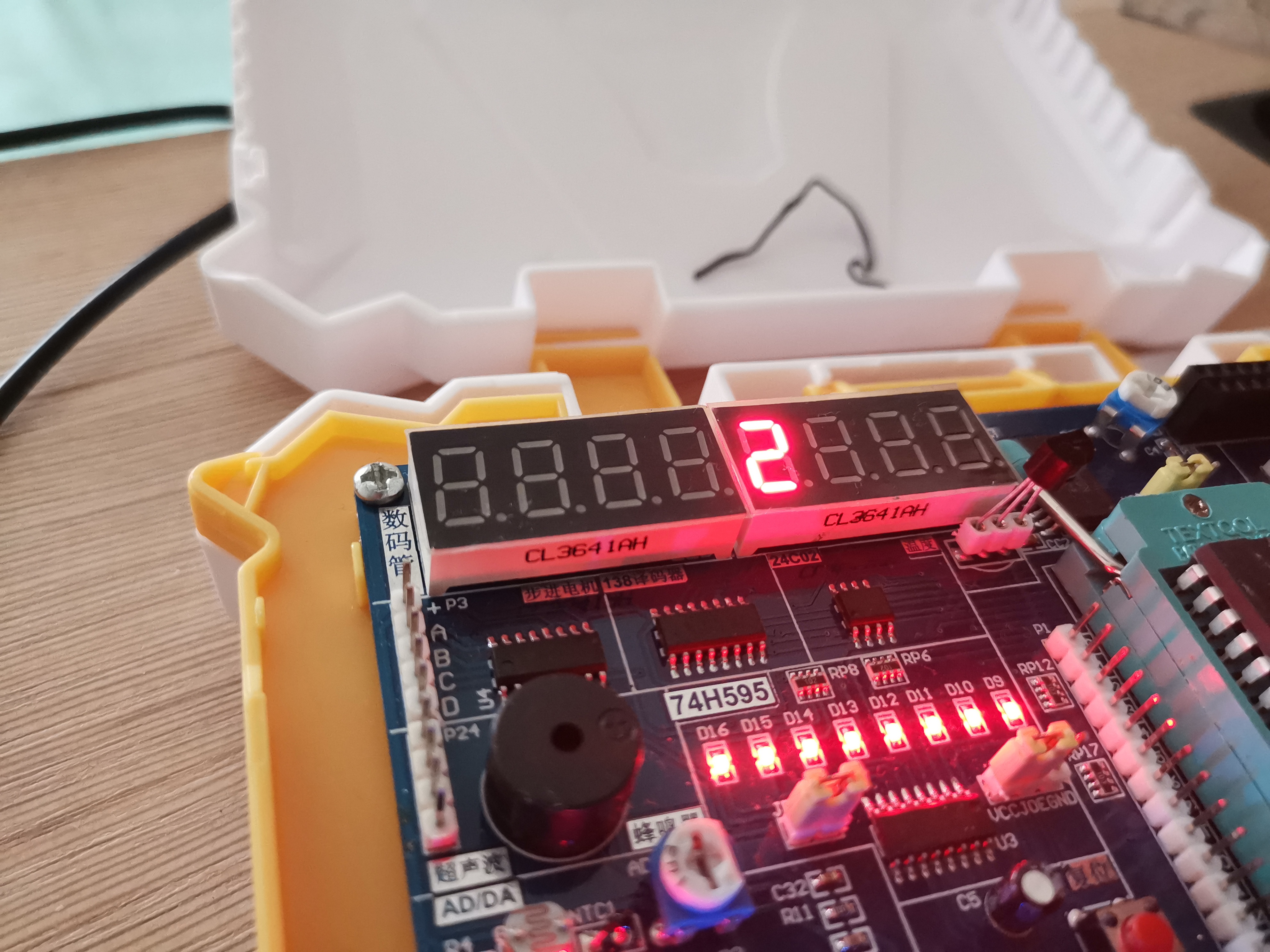在STC89C52的左上角, 有八个八段数码管. 在控制数码管点亮的过程中, 某一时刻只能根据P24 P23 P22三个引脚的高低电平情况(3-8译码器的三个输入)点亮一个数字. 这里(P24, P23, P22) = (0, 1, 1), 则从右数第四个数字亮. 再令P0 = 0x5b;//0101 1011, 则该位置显示数字"2". 补充说明一下P0给定数值与数码管引脚的对应情况: (0, 1, 0, 1, 1, 0, 1, 1) -> (h, g, f, e, d, c, b, a).