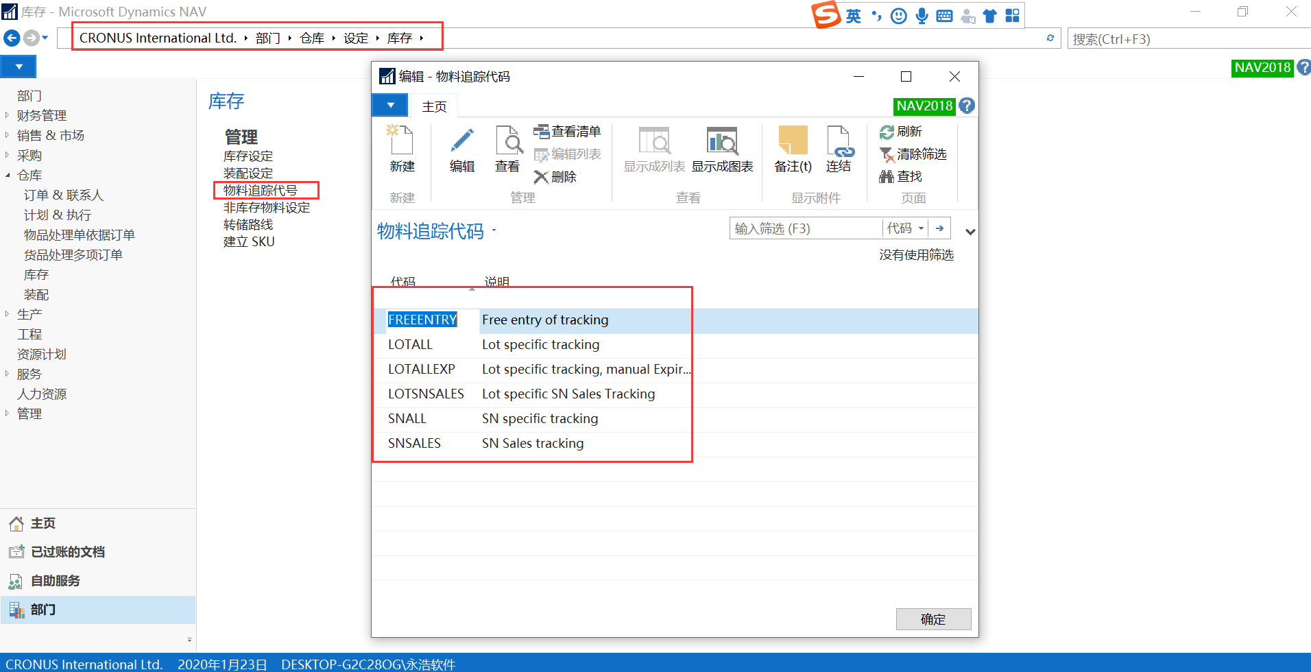 1.在CRONUS International Ltd./部门/仓库/设定/库存->新建物料追踪代码