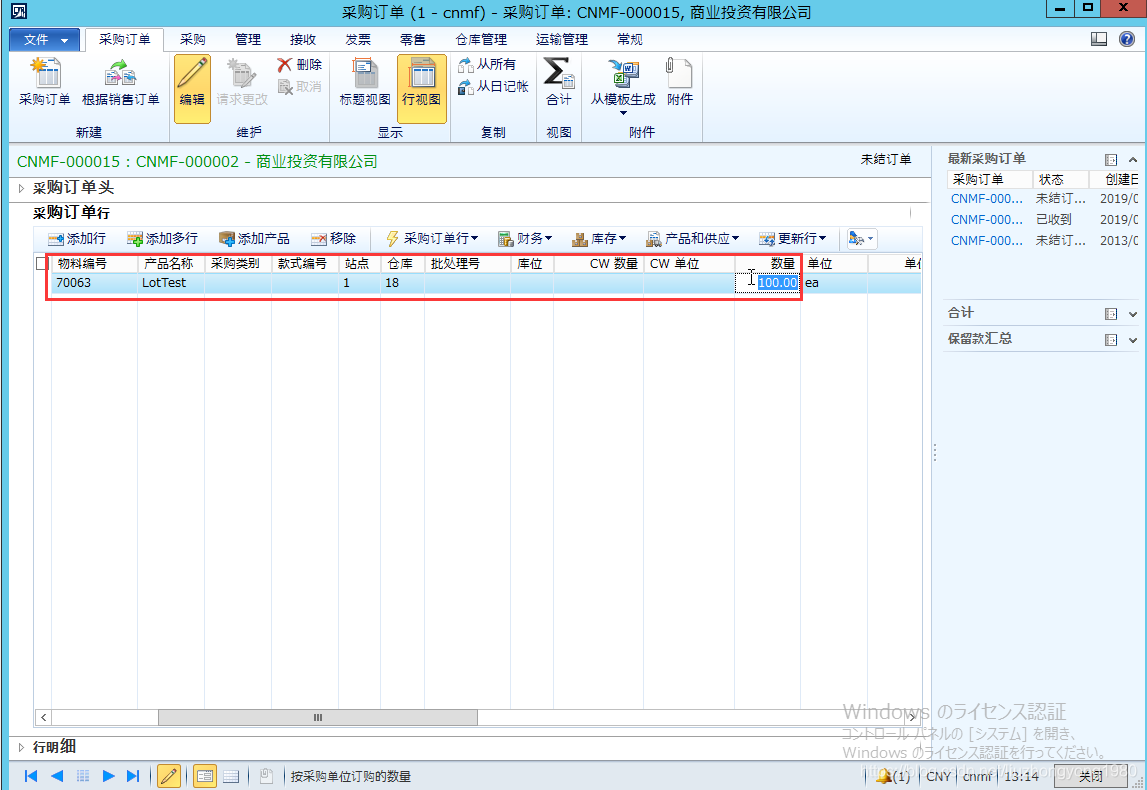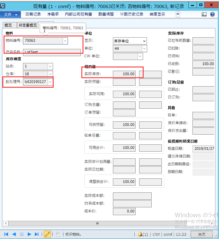 5.在采购订单中过账产品收据后,可以看到实际库存及批次信息。