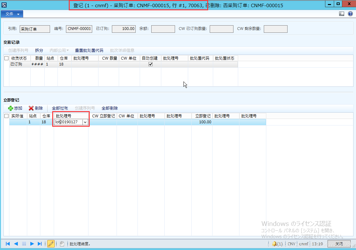 5.给采购订单中的物料70063自动追加批号。也可以手动录入自己需要的批号。