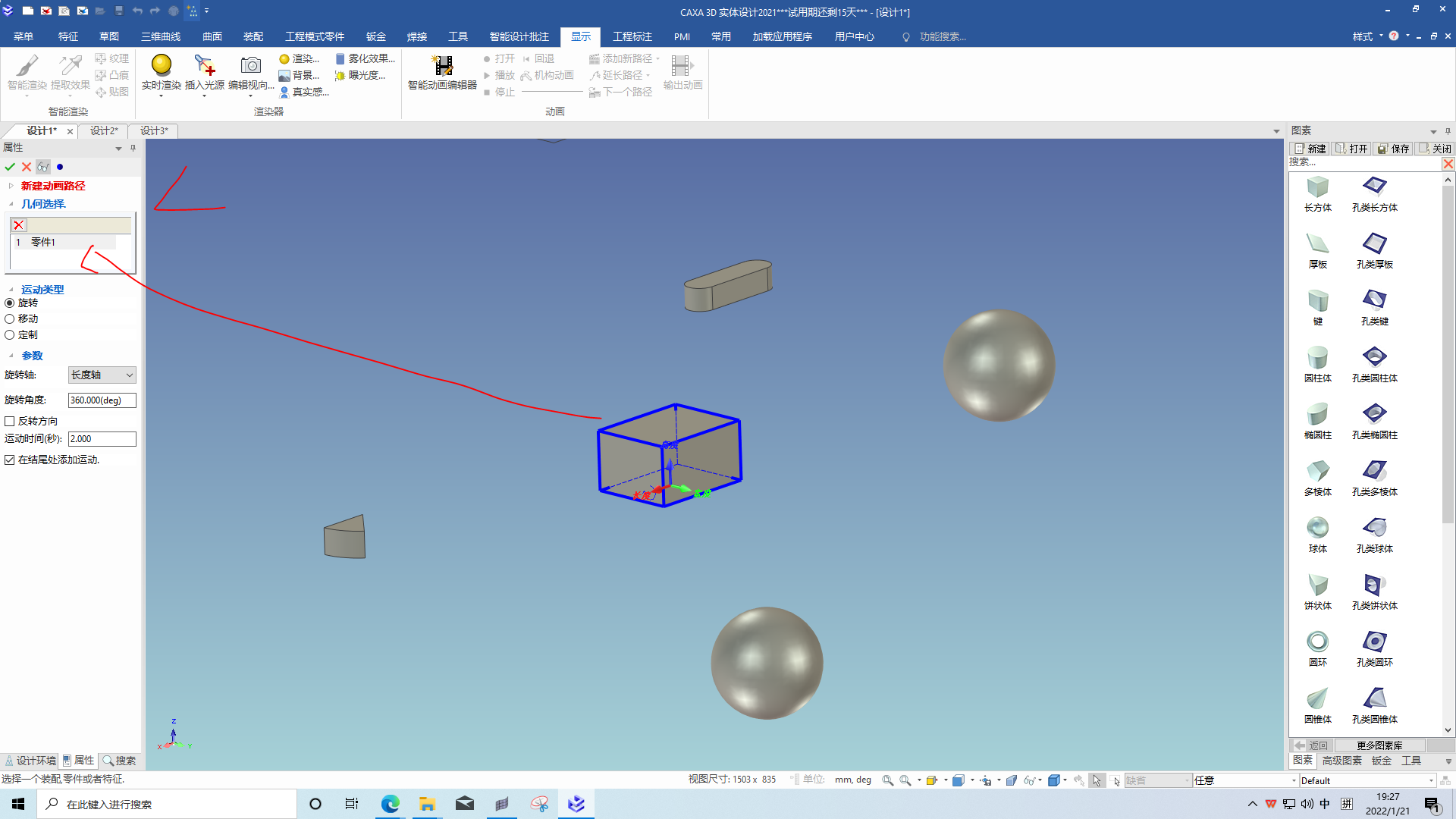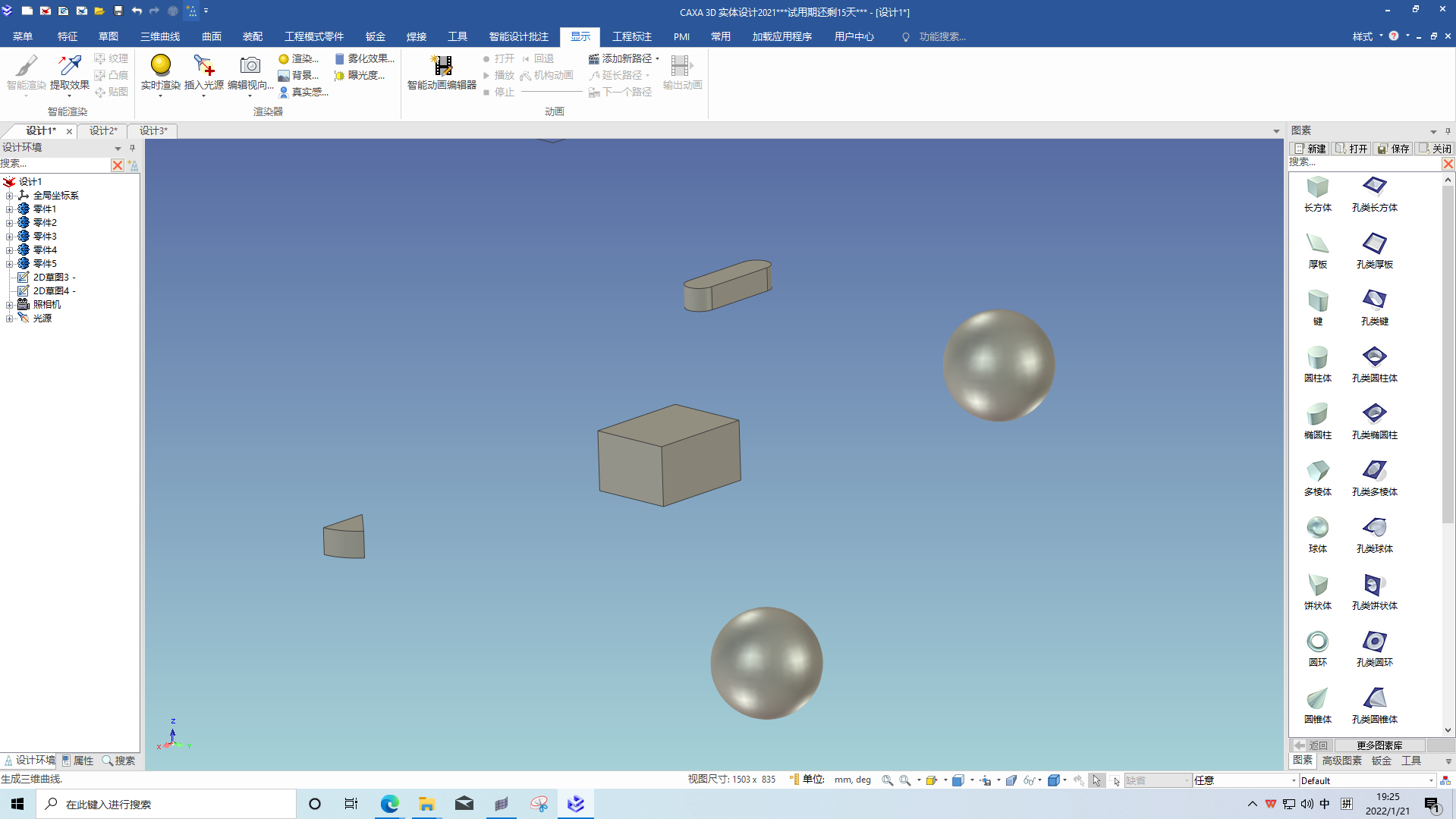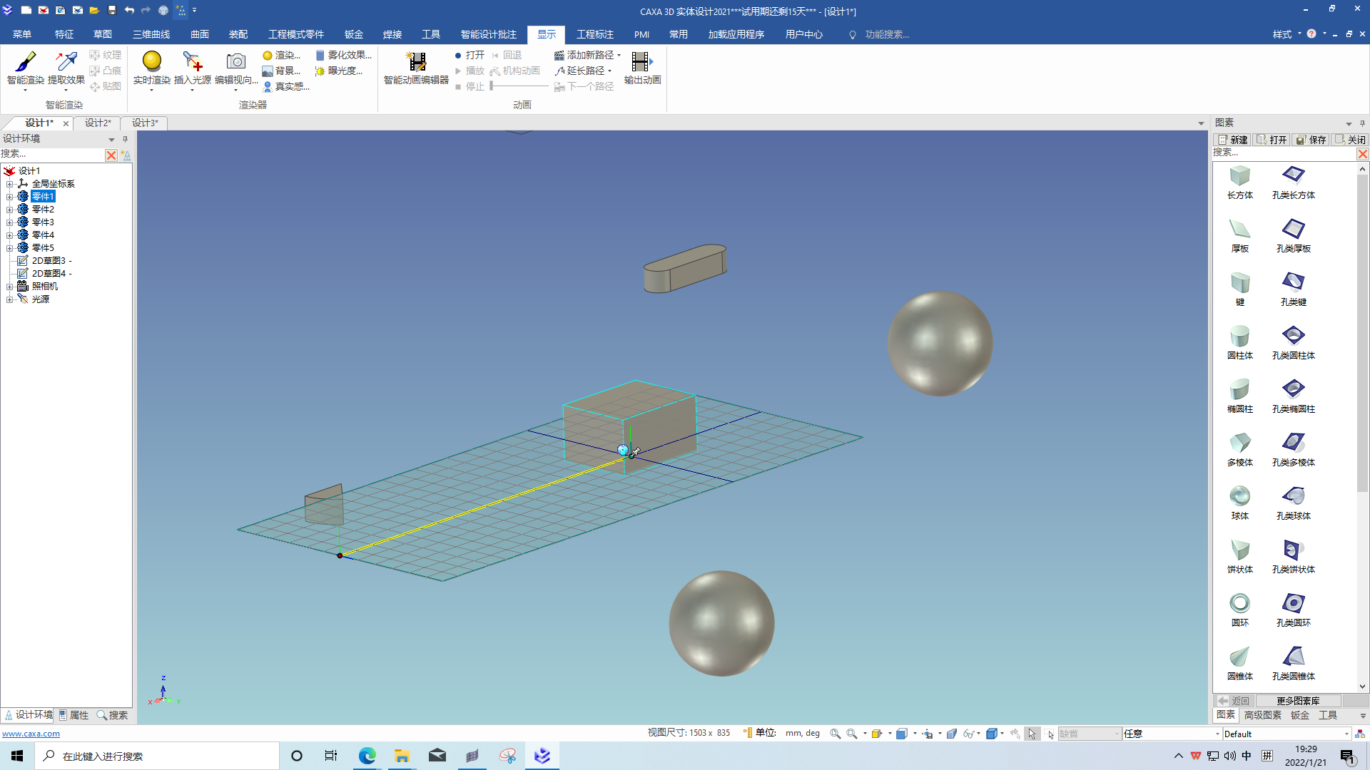 2. 向设计环境中添加多个零件(长方体、圆柱体、球体、多棱体等)