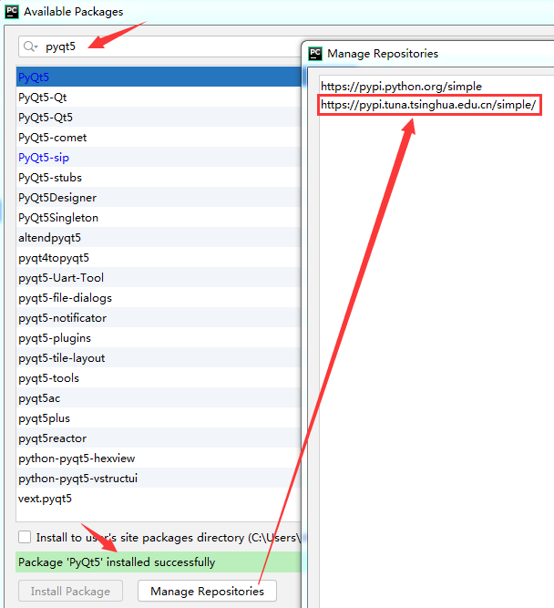 ● 在弹出的窗口中输入pyqt5检索,然后单击下方按钮“Install Package”安装。此步骤由于默认选择镜像源 https://pypi.python.org/simple,可能会由于网速原因无法成功下载安装。所以,可单击“Manage Repositories”按钮添加国内镜像 https://pypi.tuna.tsinghua.edu.cn/simple/ 便可成功下载安装。
