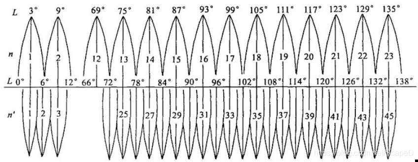 若采用分带投影的方法,可使投影边缘的变形不致过大。我国各种大、中比例尺地形图采用了不同的高斯-克吕格投影带。其中大于1:1万的地形图采用3°带;1:2.5万至1:50万的地形图采用6°带。