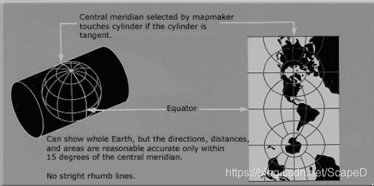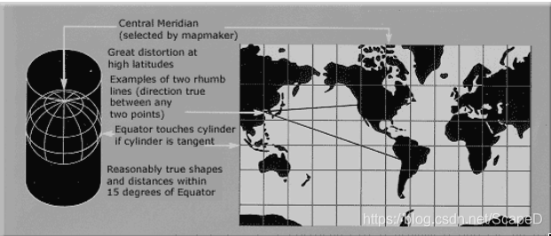 假设地球被围在一中空的圆柱里,其基准纬线与圆柱相切(赤道)接触,然后再假想地球中心有一盏灯,把球面上的图形投影到圆柱体上,再把圆柱体展开,这就是一幅选定基准纬线上的“墨卡托投影”绘制出的地图。