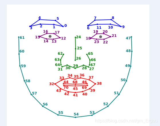 上面是一个人脸的71点特征点图,想要获取71点的坐标很简单,opencv就有自带的库可以检测特征点,这里不做详细介绍。
