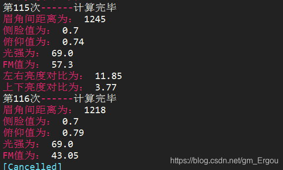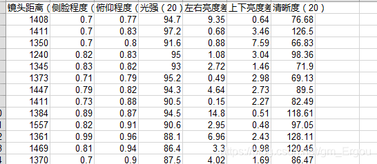 for file in files:if file.endswith('txt'):n = n + 1f1 = open(path_txt + file, 'r')line = f1.readlines()# txt文件名即为照片名lens = len(line)img = line[lens - 1].strip()files = 'data2/img/1/' + imgarr = get_arr(line) # 把文本特征点坐标,转化为arr,留待后用distance = get_distance(files, line, arr) # 把特征点坐标取出来,计算前后左右俯仰table2.write(n,0,float(distance[0]))table2.write(n,1,float(distance[1]))table2.write(n,2,float(distance[2]))table2.write(n,3,float(distance[3]))table2.write(n,6,float(distance[4]))print("眉角间距离为:",distance[0])print("侧脸值为:",distance[1])print("俯仰值为:",distance[2])print("光强为:",distance[3])print("FM值为:",distance[4])light1=get_left_right_light(arr,files)light2=get_top_bottom_light(arr,files)print("第" + str(n) + "次------计算完毕")# #把计算区域画出来# save_light1='data/rect/light1/'# save_light2='data/rect/light2/'# save2='data/rect/left_right/'# save3='data/rect/71/'# function.draw_face(save_light1,files,light1[0],'left',light1[2],light1[3]) #把左右光亮度区域标记出来# function.draw_face(save_light1,files,light1[1],'right',light1[4],light1[5])# function.draw_face(save_light2,files,light1[0],'top',light2[2],light2[3]) #把光亮度区域标记出来# function.draw_face(save_light2,files,light1[1],'bottom',light2[4],light2[5])# function.draw_eye(save2,files,arr,distance[5],distance[6]) #把眼间距标记出来# function.draw_point(save3,files,line,arr) #把71点标记出来ws.save(path)