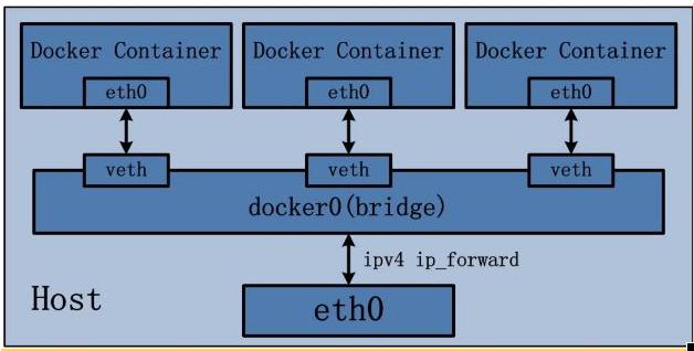 在默认情况,Docker使用bridge网络模式,bridge网络驱动的示意图如下,我们先以bridge模式对Docker的网络进行说明。