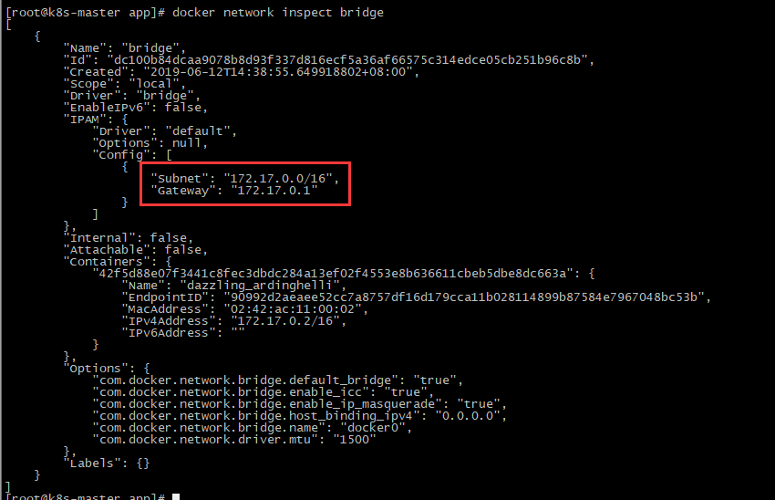 通过 docker network inspect bridge 可以查看网桥的子网网络范围和网关: