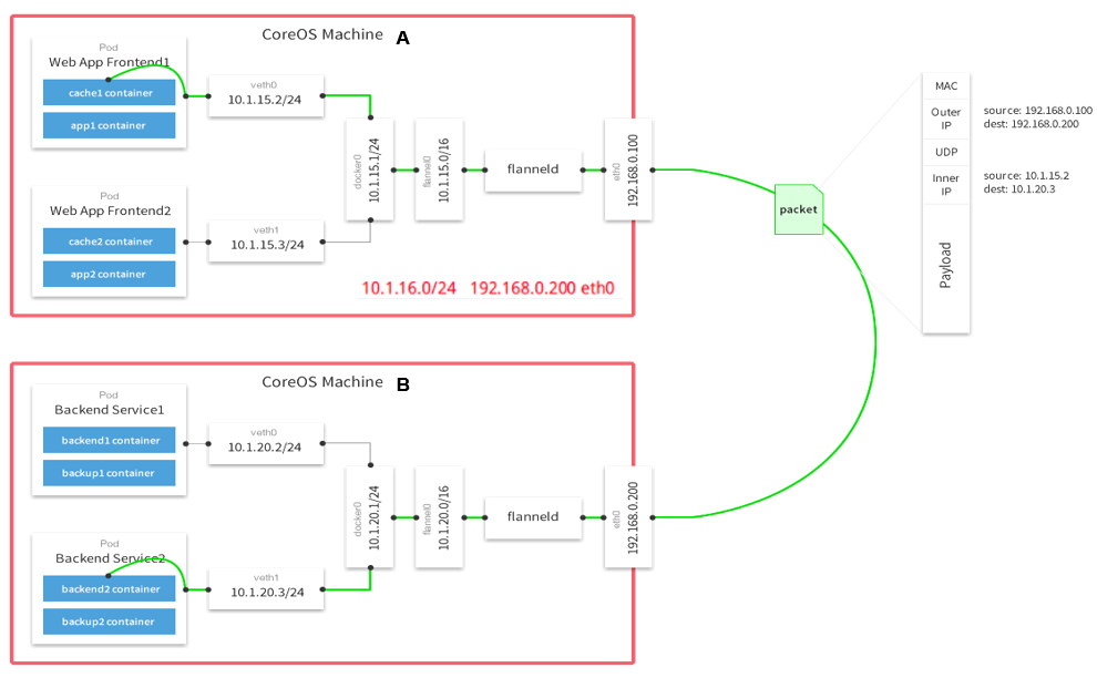 从这个图片里面里面可以看出两台机器的docker0分别处于不同的段:10.1.20.1/24 和 10.1.15.1/24 ,如果从Web App Frontend1 pod(10.1.15.2)去连接另一台主机上的Backend Service2 pod(10.1.20.3),网络包从宿主机192.168.0.100发往192.168.0.200,内层容器的数据包被封装到宿主机的UDP里面,并且在外层包装了宿主机的IP和mac地址。这就是一个经典的overlay网络,因为容器的IP是一个内部IP,无法从跨宿主机通信,所以容器的网络互通,需要承载到宿主机的网络之上。