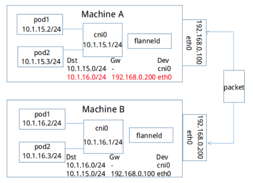 Machine A中的容器要与Machine B中的容器进行通信,封包是如何进行转发的?