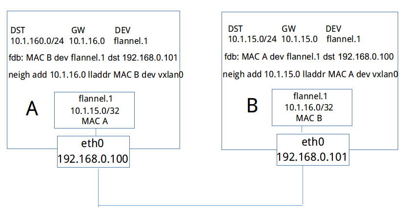 现在有一个容器网络封包要从A发往容器B,和其他backend中的场景一样,封包首先通过网桥转发到主机A中。此时通过,查找路由表,该封包应当通过设备flannel.1发往网关10.1.16.0。通过进一步查找arp表,我们知道目的地址10.1.16.0的mac地址为MAC B。到现在为止,vxlan负载部分的数据已经封装完成。由于flannel.1是vtep设备,会对通过它发出的数据进行vxlan封装(这一步是由内核完成的,相当于udp backend中的proxy),那么该vxlan封包外层的目的地址IP地址该如何获取呢?事实上,对于目的mac地址为MAC B的封包,通过查询fdb,我们就能知道目的主机的IP地址为192.168.0.101。