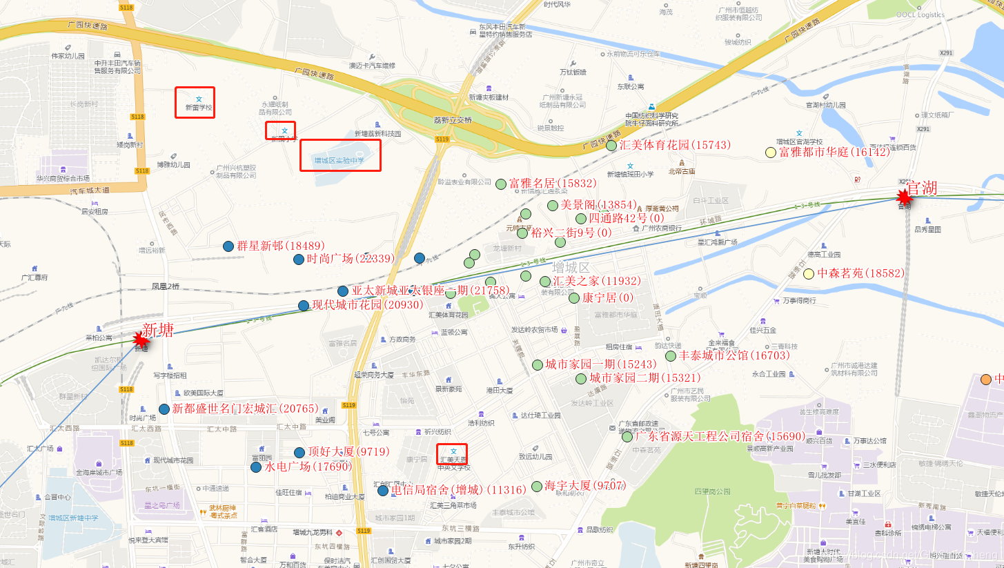 有了上两张图,我们其实可以获取到很多的信息的:1.距离地铁站比较近的小区有哪些;2. 小区的销售均价;3.通过影像图可以分析周边地理环境,如植被覆盖情况;4.通过矢量图可以分析交通情况、周边人文情况,如学校、商超等。