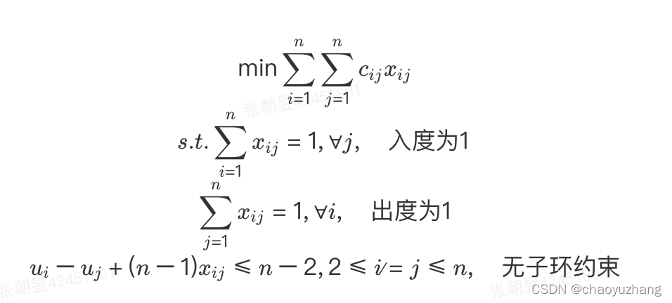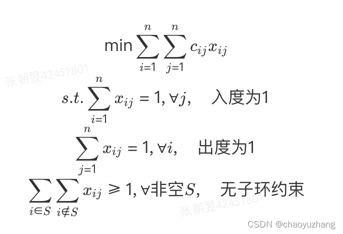 该模型较好理解,前面两个约束保证对每个点入度为1,出度也为1,第三个约束保证每个非空集合到其补集一定有边相连