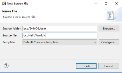 - 在BSP工程中,选中user目录上右键,选择“New→Source File”菜单,新建一个bspHelloWorld.c文件。