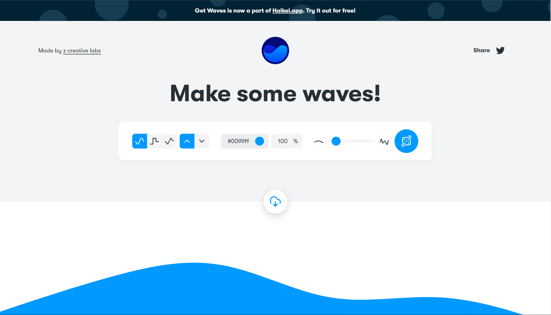 “Get Waves”只有一个功能,就是做波浪图案,使用者打开首页可以调整波浪的参数,制作不同的波浪图案,并在下方预览,下载觉得合适的波浪图案。