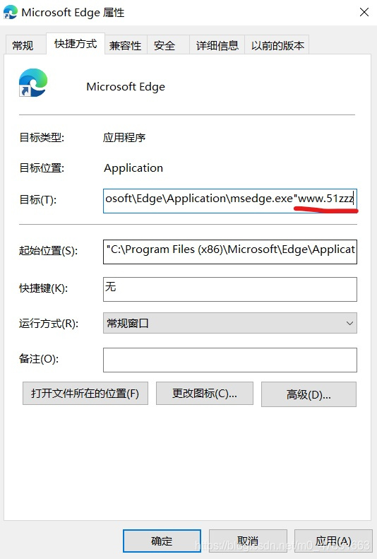 第二步:快捷方式-目标-将.exe''后的网址删除-点击应用即可