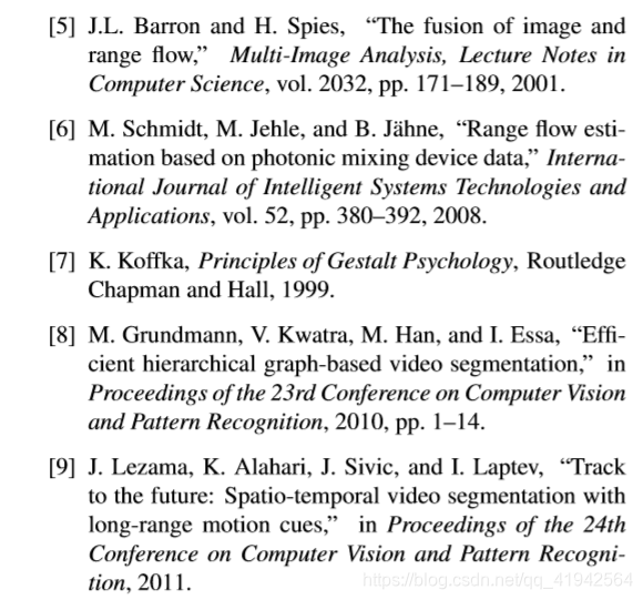 与描述两幅强度图像之间运动的光流类似,距离流[3]是指从一系列距离图像中导出的运动矢量。关于可变形表面上的距离流估计的初步工作,可在[4]中找到。Spies等人[3]给出不同类型三维结构情况下的距离流解决方案。Barron和Spies[5]在最小二乘框架中整合了距离流和光流。使用距离和强度信息可以导致更密集的流场。但是,不能保证每个像素都计算出了流向量。为了解决这个问题,[3]使用迭代正则化算法计算稠密流场。Schmidt等人[6]使用针孔相机模型,将TOF相机的传感器观测值直接合并到距离流约束方程中。 共同运动和空间接近是分组的有力线索[7]。这些知识在不同的分割方法中有不同的融合,根据结果的性质,这些方法可以分为两组。导致密集分割的方法通常基于局部运动提示(例如,光流[8])。然而,由于两个物体的运动可以在局部相似,这些方法可以从其他信息中获益,例如长期运动提示[9]、颜色[8]或深度。第二类分割方法对问题有更全局的看法。他们使用跟踪来导出稀疏点轨迹,这些轨迹根据全局运动相似性进行分组(例如[9])。然而,由于轨迹是稀疏的,分割的结果也是如此。为了将剩余的点分配给段,必须包含附加信息(例如,颜色[9])。因此,各种分段方法[9,10]利用更密集的点轨迹[11,12]。这些轨迹是精确的,但不能保证每个像素将被分配到一个轨迹(或随后的一个段)。 在本文中,我们的目标是将一段距离视频中的所有点组合成相干运动段。除了深度(由TOF相机获得),我们还结合了长期运动信息。与[12]类似,我们从先前计算的运动矢量中得出轨迹(第2.1节)。与之前的方法不同,我们尝试为距离视频的每个像素导出轨迹(第2.2节)。在第2.3节中,我们使用一种高效的基于图的分割技术[13,8]根据轨迹的空间和运动相似性对轨迹进行分组。第3节展示了我们的算法在实验室记录的视频上的能力,并将结果与最先进的分割方法进行了比较[8]。对不同加工步骤所得结果进行了说明和讨论。