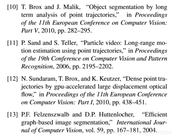 研究表明,长期运动分析有利于分割[9,10]。与局部运动相反,例如距离流, 轨迹考虑了点的整个运动,并且能够消除局部类似运动的歧义(见图1)。我们通过应用类似于[12]的基于流矢量的跟踪器来获得密集点轨迹。与[12]相反,我们不删除难以跟踪的点,而是尝试覆盖整个视频。