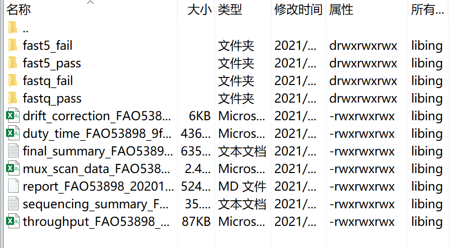 牛津纳米孔技术(ONT,Oxford Nanopore Technologies)公司的生产的测序产品从小到大,常用的主要是接512通道芯片的MinION和接3000通道芯片的PromethION两款测序仪。其中两者均可生产包括原始fast5格式数据(包含测序条件等数据)和碱基识别后的fastq格式数据(含质量值的数据)。如图最新一次MinION下机数据,其中电脑驱动软件为MinKNOW(内置Guppy)。