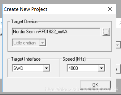 PP部分可以知道是芯片的封装,我这个封装形式是QFN,然后VV我买的这个芯片填的是AC,故他的flash大小为256kb,ram为32kb。因此刚刚做flash烧录时,其实选择AC,AB还是AA都是可行的,只是说如果想把资源扩展到最大,那么可以选择AC。故其实对于我的芯片来讲,选择哪个都可以,只是利用资源的大小不一样而已。我就随便选择一个51822_xxAA。由于接口方面nrf51822提供调试接口是SWD方式,因此在Target interface下选择SWD。