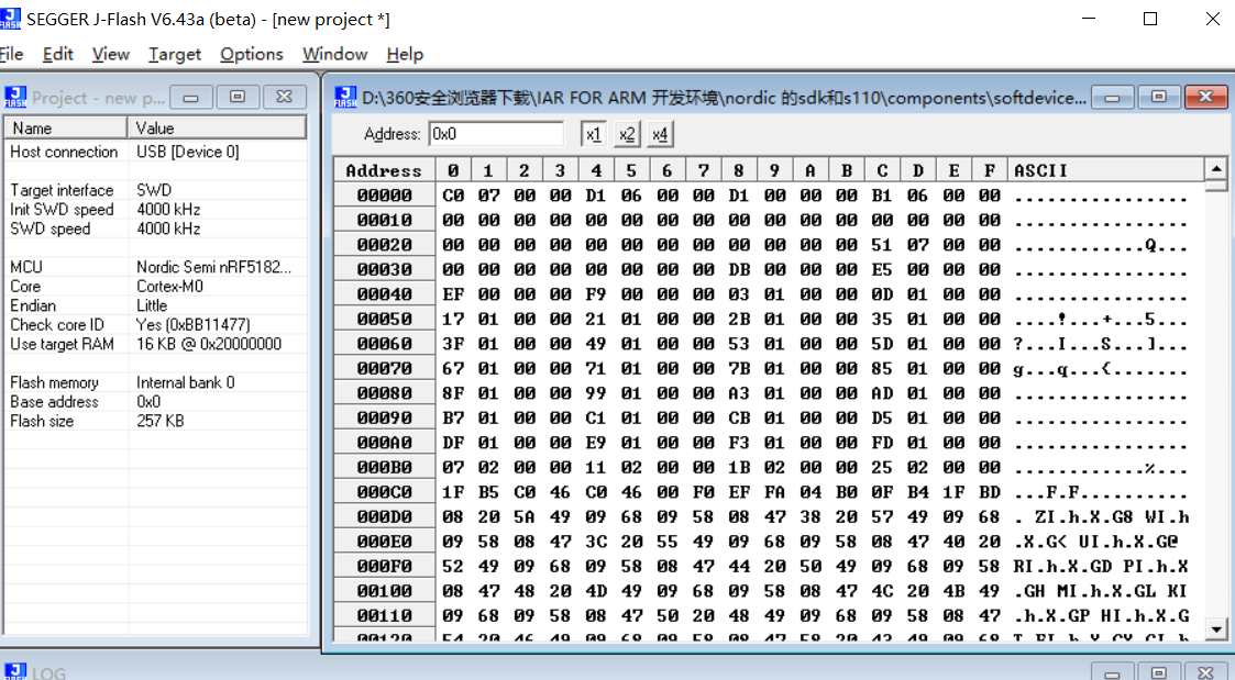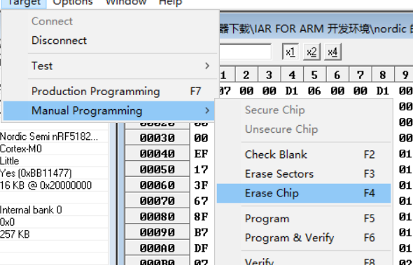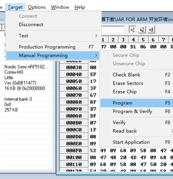 如果只是先学习操作简单外设驱动,可以不烧录s110这个hex固件,直接擦除就能烧录不带s110协议栈的IAR工程了,不过本人测试了一下,即使烧录了s110固件,还是可以烧录IAR不带s110协议栈的外设驱动程序,因此为了后面不需要重烧一次,最后直接在target菜单上选择manual programming再选择program或者program & verify。