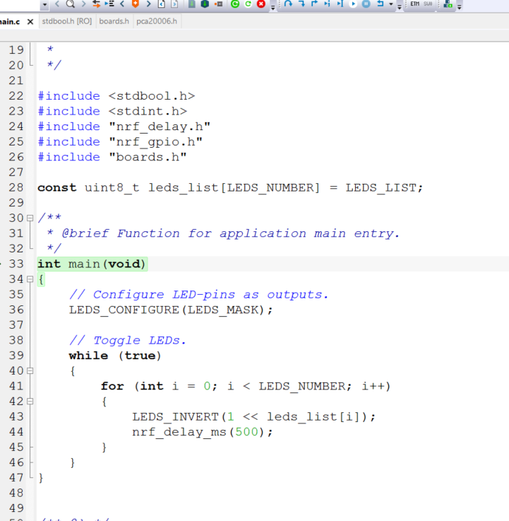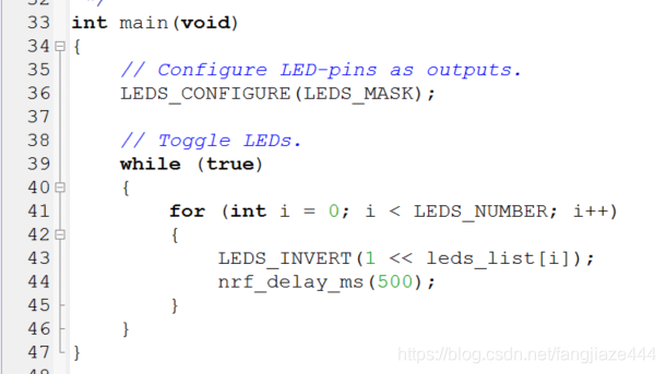 所以主函数就第一步,配置led,函数是LEDS_CONFIGURE(其实是个宏)。下面就做一个轮流翻转led的操作。
