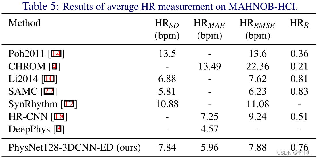 PhysNet128-3DCNN-ED模型在OBF上的性能最好,我们用它在MAHNOB-HCI上进行交叉测试,以验证其泛化能力。如表5所示,我们使用本方法的HR结果与之前的方法比较(之前的工作只有HR结果,无HRV水平)。