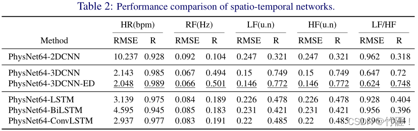 我们固定视频切片长度为64,损失函数为nepea,以此来评估时空网络的有效性。首先,我们用PhysNet-2DCNN作为评估基线。
